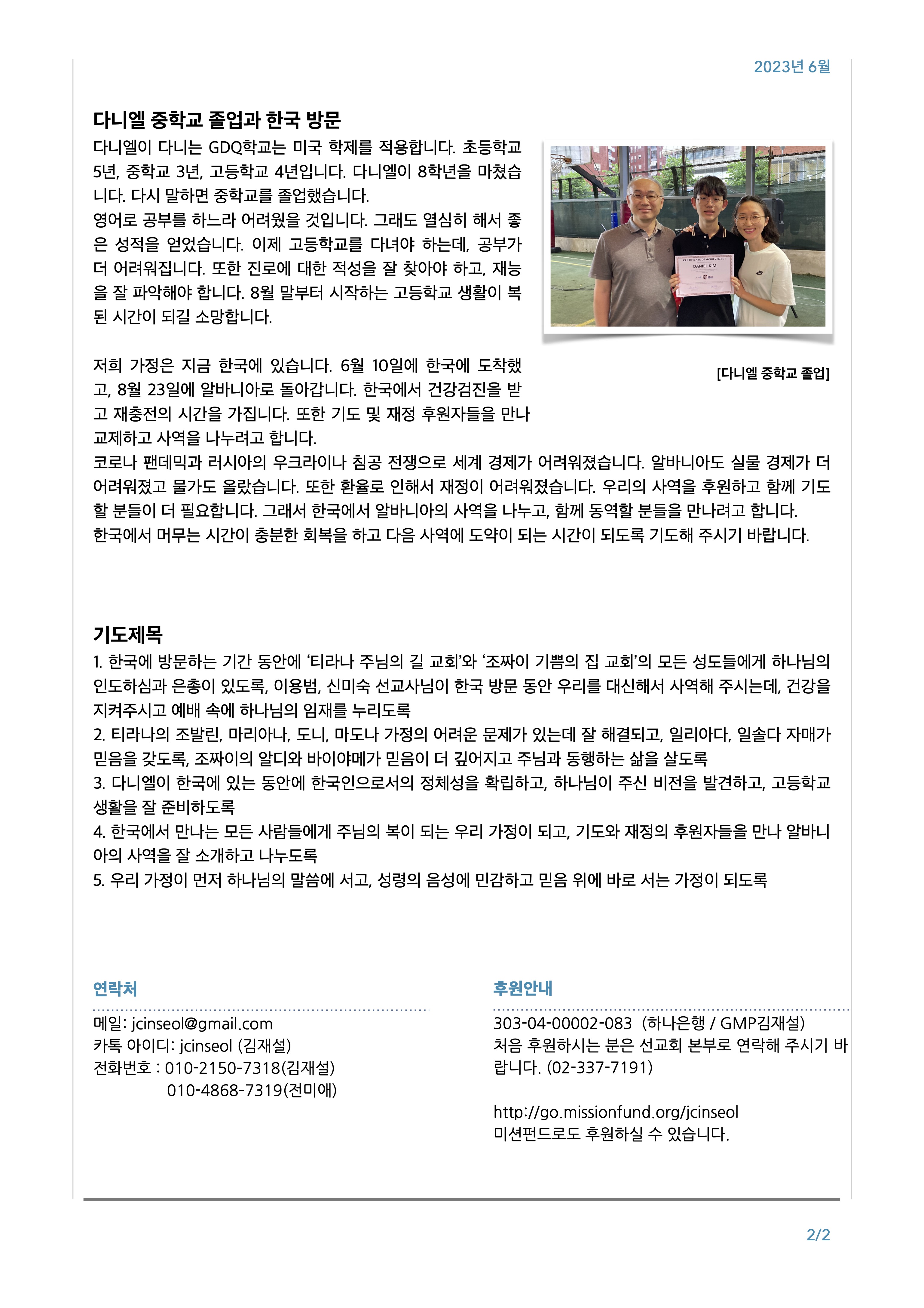 기도...함께 2023년 6월 기도편지 알바니아 사랑 2023. 6. 28. 15:14 이제까지 기도편지를 쓴 것을 자주 여기 올리지 않았습니다. 지금부터라도 잘 올려야겠어요. 공유하기 게시글 관리 알바니아를 향한 하나님의 사랑 '기도...함께' Related Articles 2024년 1월 기도편지 2023년 10월 기도편지 2016년 5월 소식 2015년 7월 기도편지